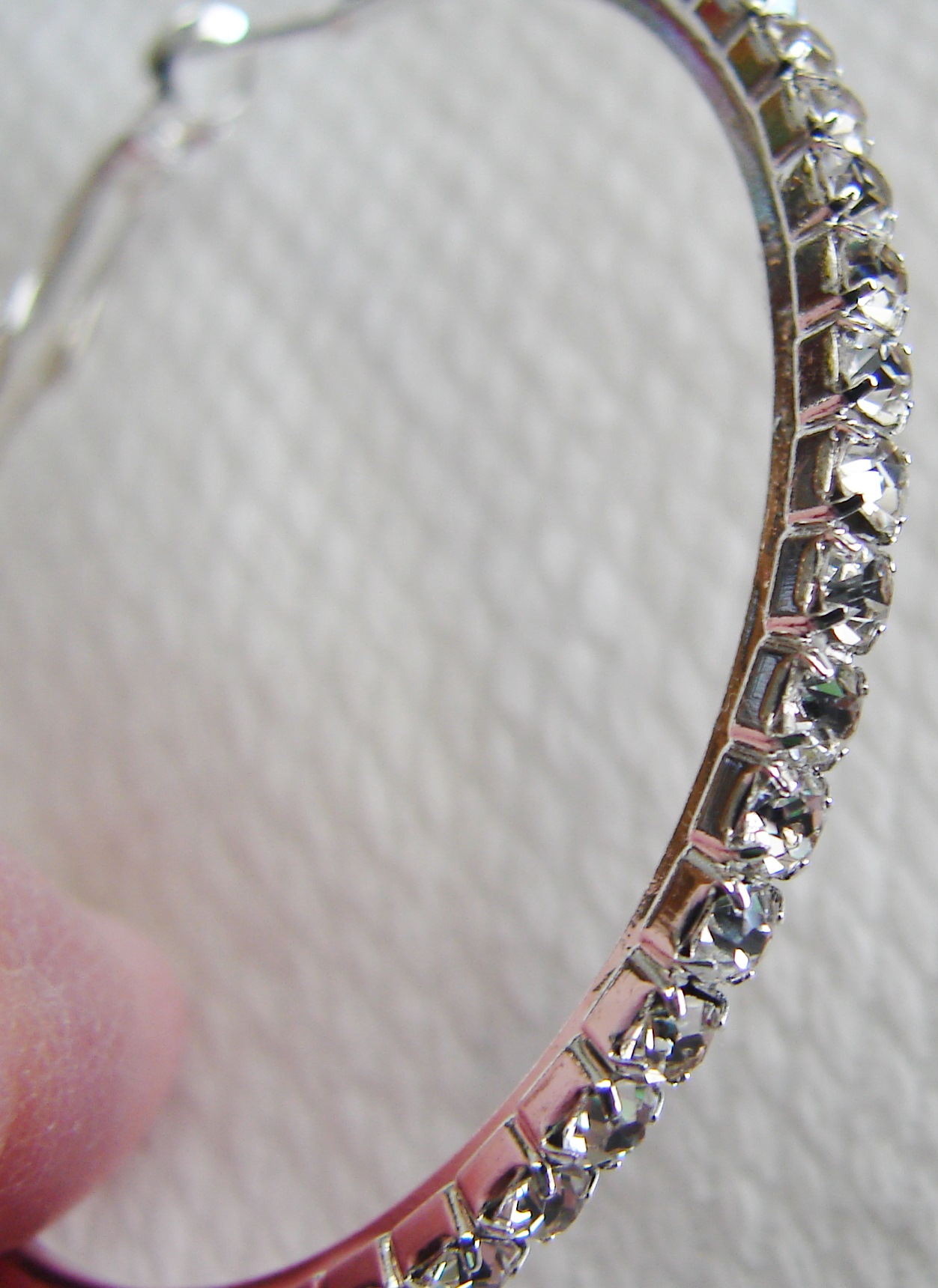 These gorgeous hoop earrings are 2" in diameter with lots of clear cystals along the silver hoop. Very pretty to wear. Free shipping in the USA