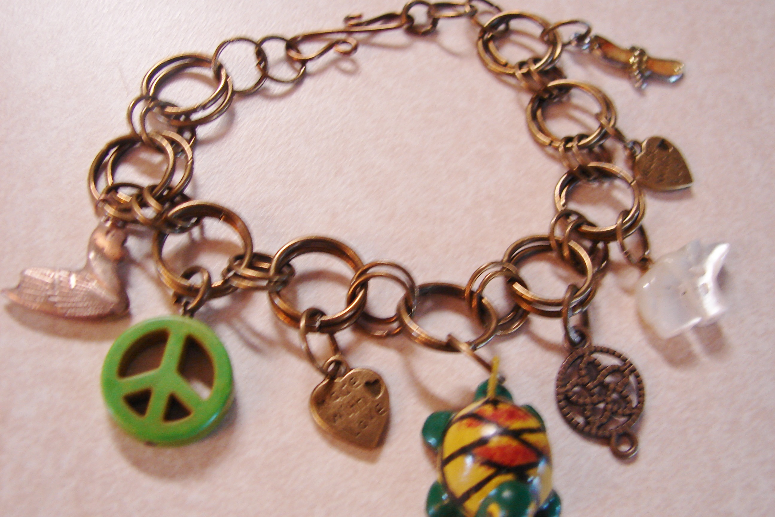 Amazing little charm bracelet with a peace sign, a ceramic turtle, 2 hearts, a duck, flower nd a bird. It is all made of antique bronze jump rings and can be adjustable from 7 1/2" down some. As you can see its somewhat colorful. Free shipping in the USA