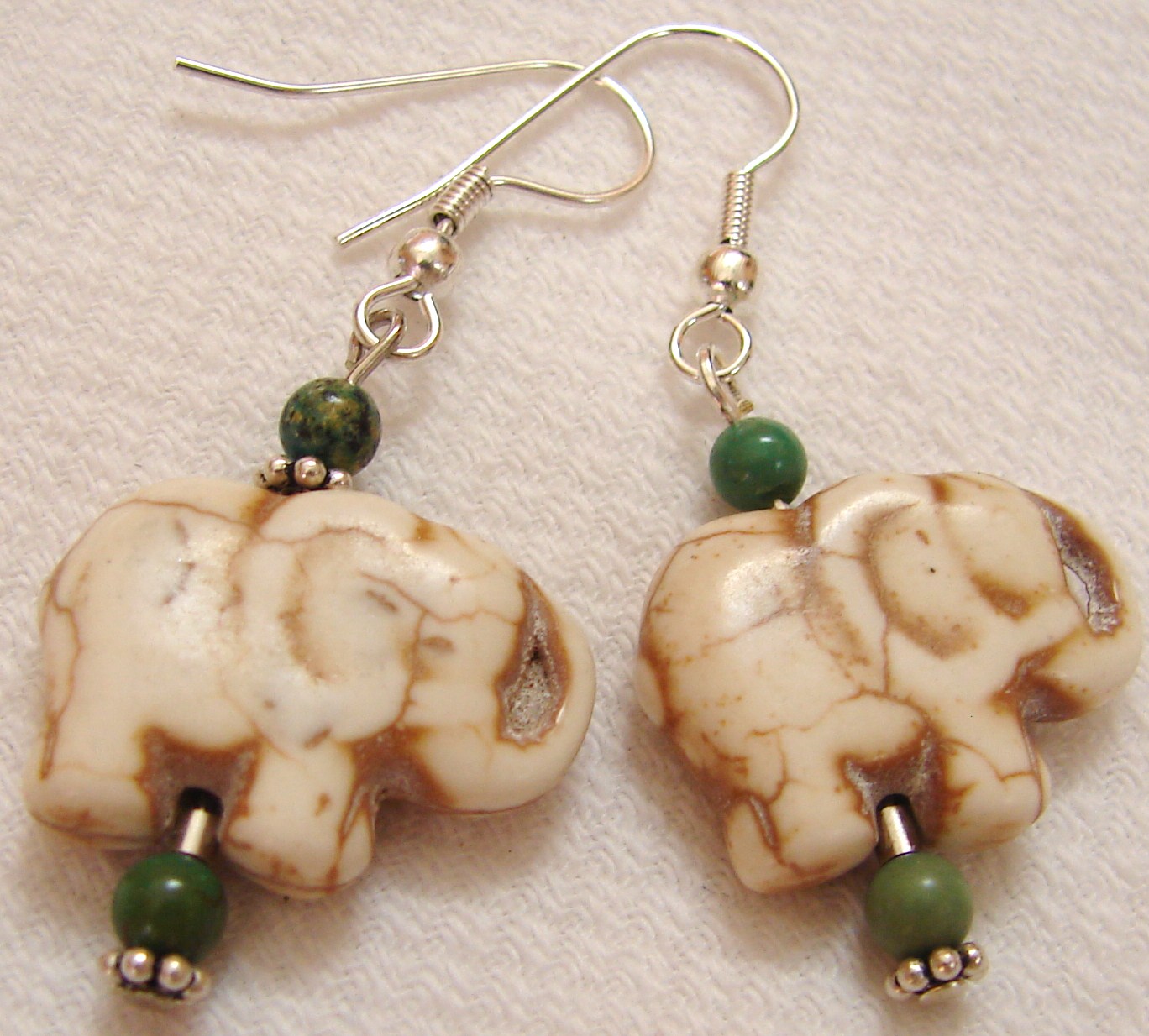 Darling pair of elephant earrings. The elephants are carved bone, a tuquoise bead is on top and bottom of each earring along with a tiny sterling silver bead at the bottom. The wires are silver. The elephants are 3/4" and total from wire to bottom is 1 1/4". FREE SHIPPING IN USA