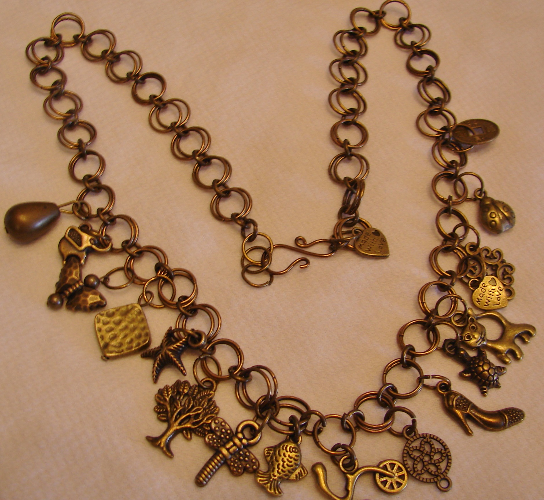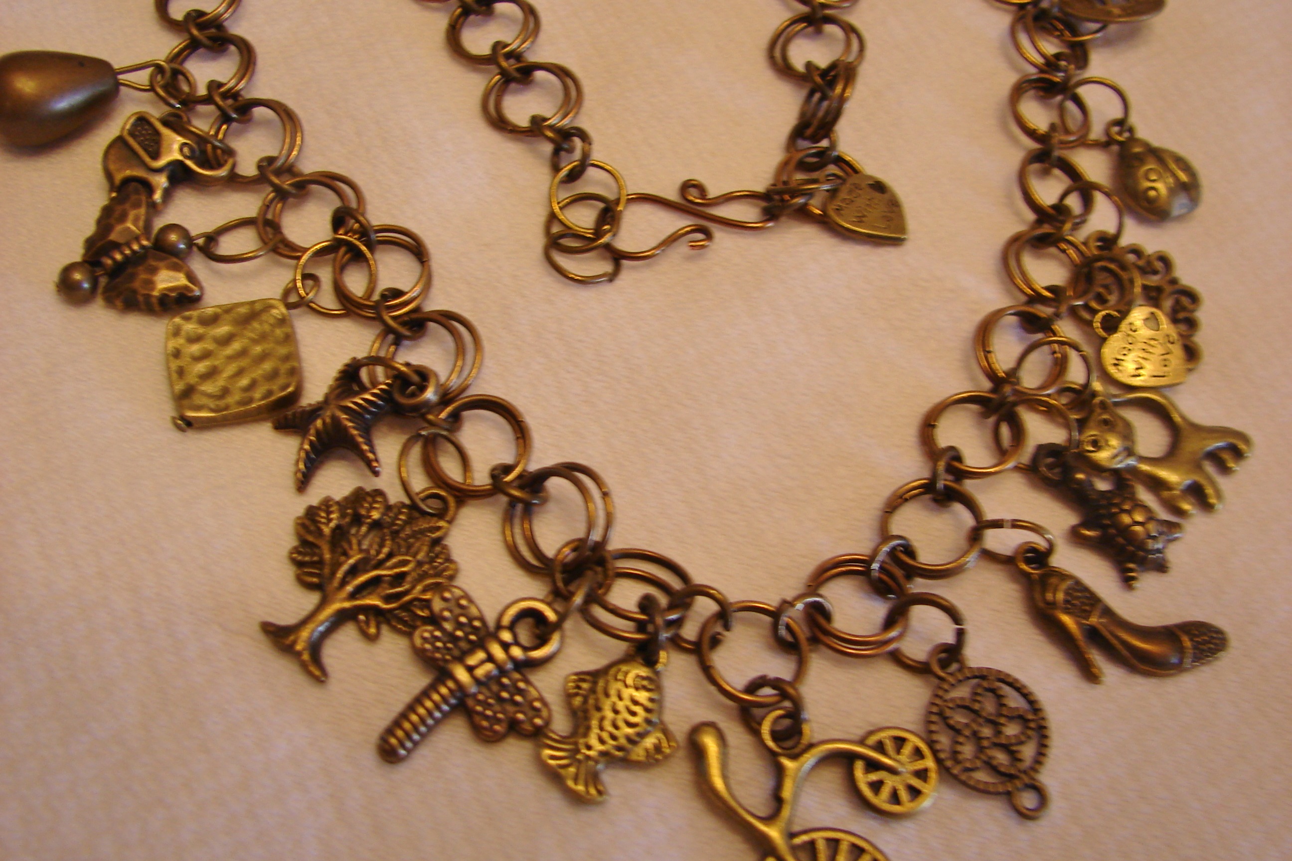 Antique Bronze chain holds lots of charms also in bronze. You can see bicycle, lady bug, cat, turtle, tree, elephant, shoe, fish,dragonfly, butterfly, starfish plus other items. 20" long. Really cool look. FREE SHIPPING IN THE USA