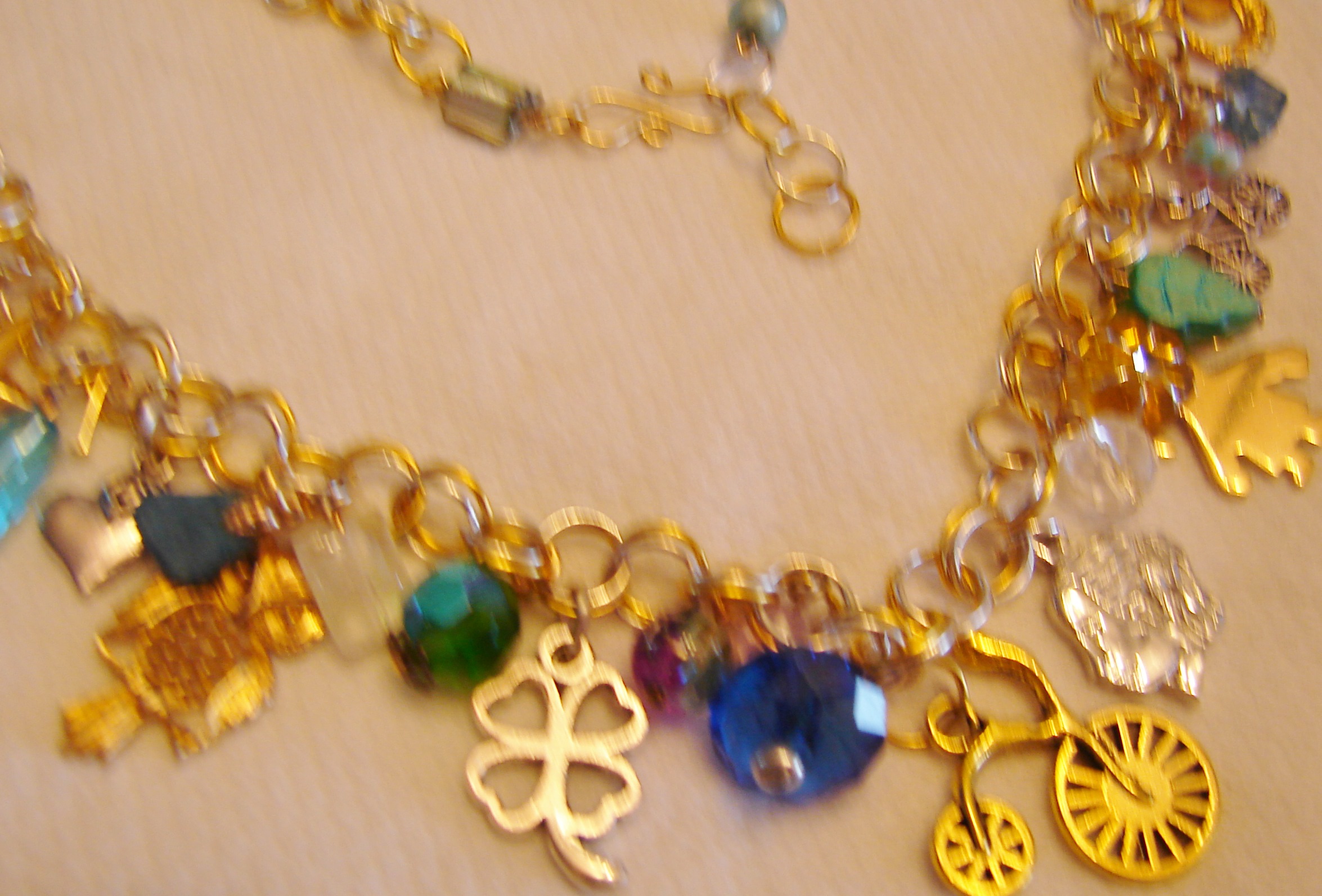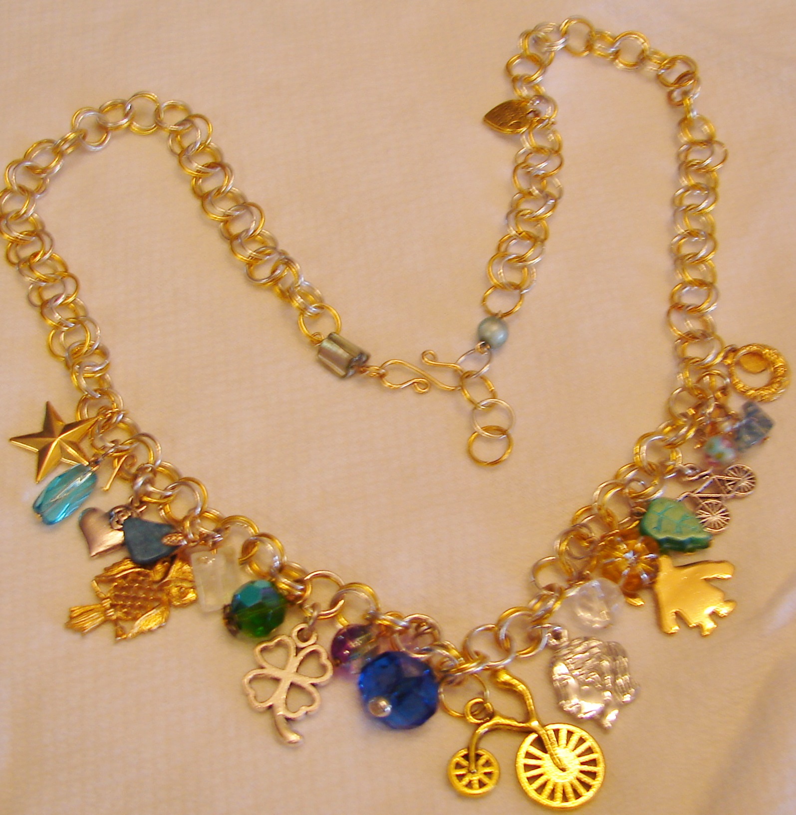21" long this chain is so pretty with all its charms, like stars, bikes, Owl, faces, Hearts, crystals, clover, etc. All in gold tone and silver. Free shipping in the USA